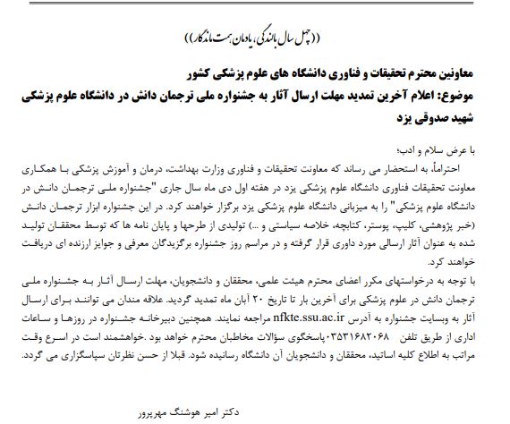 اعلام آخرین تمدید مهلت آثار به جشنواره ملی ترجمان دانش در دانشگاه علوم پزشکی شهید صدوقی یزد