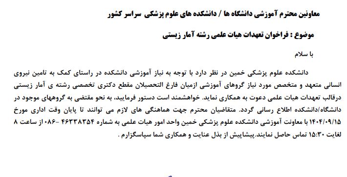 فراخوان تعهدات هیئت علمی در رشته آمار زیستی دانشکده علوم پزشکی خمین