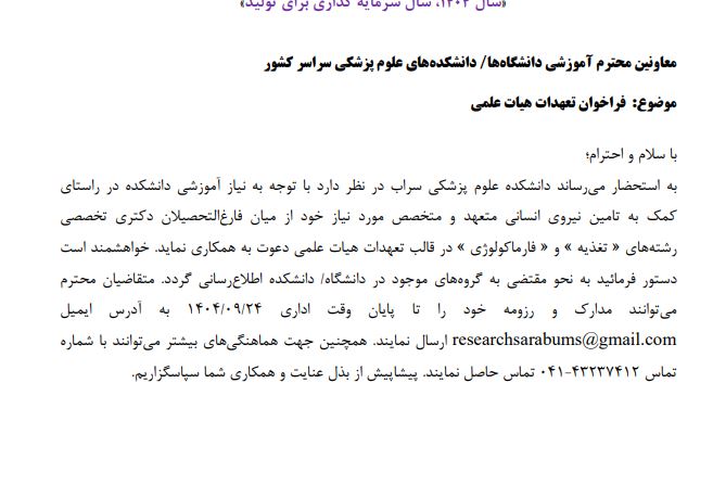 فراخوان تعهدات هیات علمی دانشکده علوم پزشکی سراب در نظر دارد با توجه به نیاز آموزشی از میان فارغ التحصیلان رشته تغذیه و فارماکولوژی دعوت به همکاری نماید