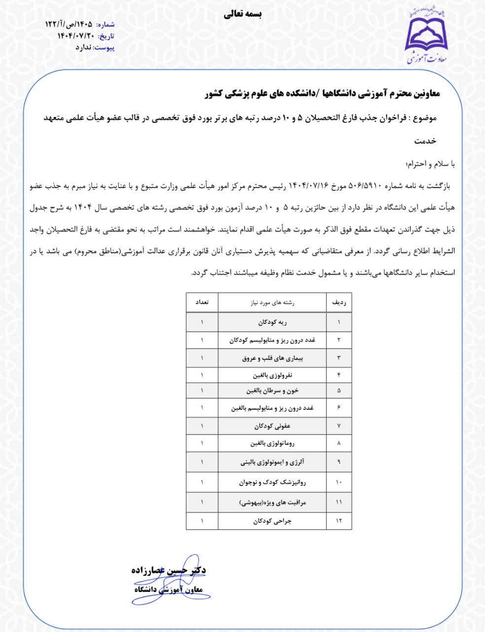 فراخوان جذب فارغ التحصیلان 5 و 10 درصد رتبه های برتر بورد فوق تخصصی در قالب عضو هیأت علمی متعهد خدمت