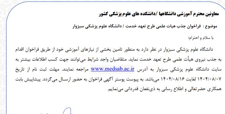 فراخوان جذب هیات علمی طرح تعهد خدمت دانشگاه علوم پزشکی سبزوارمهلت ثبت نام از تاریخ 1404/8/7 لغایت 1404/8/14