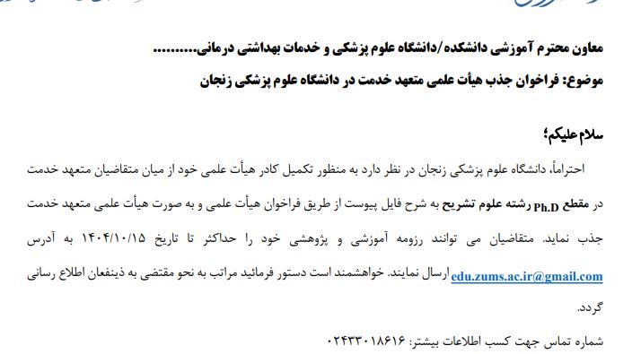 فراخوان جذب هیات علمی متعهد خدمت در دانشگاه علوم پزشکی زنجان
