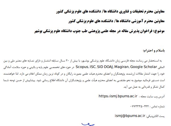 فراخوان پذیرش مقاله در مجله علمی پژوهشی طب جنوب دانشگاه علوم پزشکی بوشهر