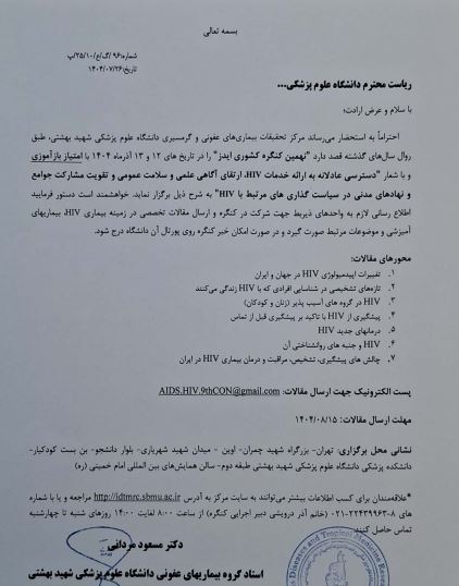 مرکز تحقیقات بیماریهای عفونی و گرمسیری دانشگاه علوم پزشکی شهید بهشتی نهمین کنگره کشوری ایدز را برگزار می نماید