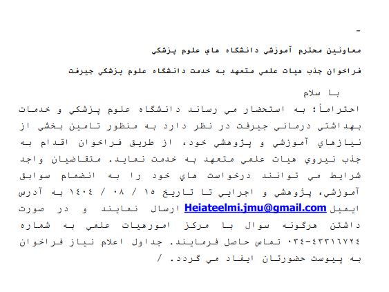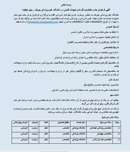 دانشگاه علوم پزشکی جیرفت اقدام به جذب نیروی هیات علمی متعهد به خدمت نموده است